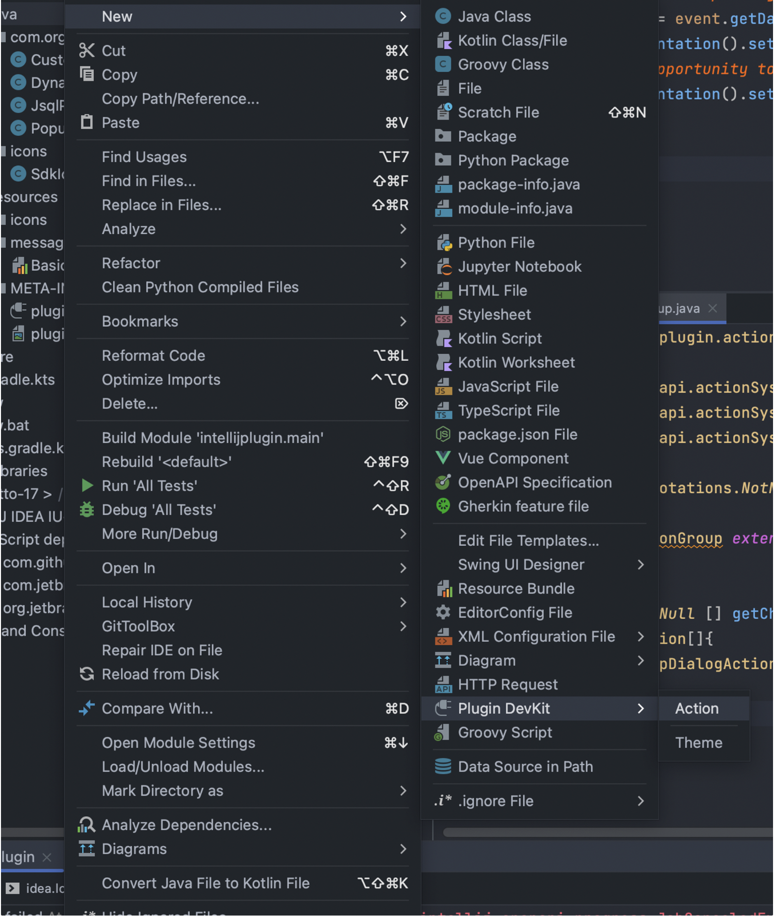 그러니까 여기에 ( 소스 파일에 우클릭을 해야 Plugin DevKit 항목이 보임에 유의 )