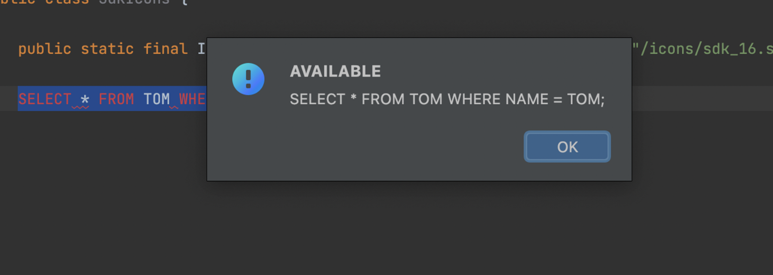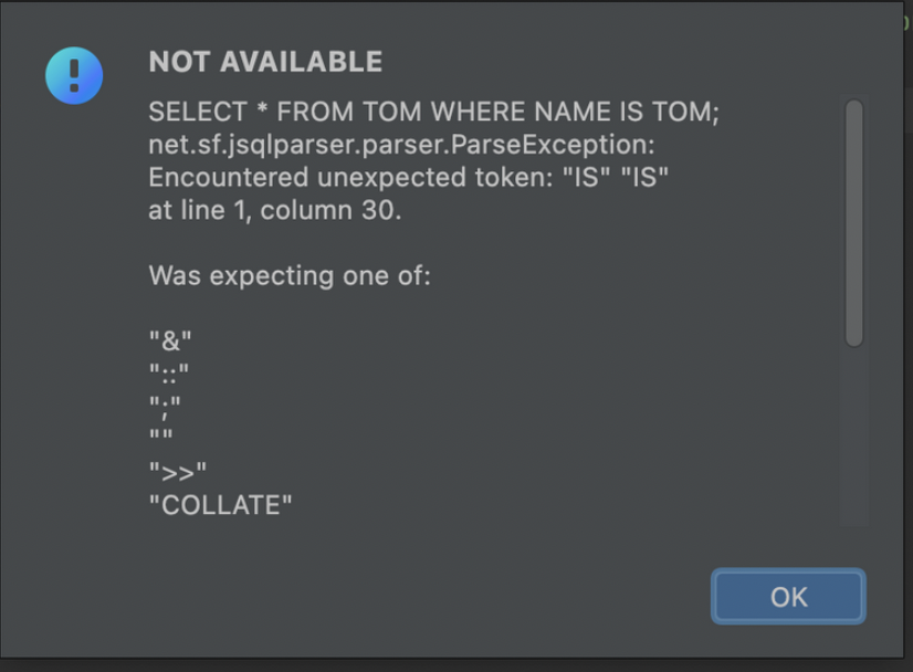 Messages.showMessageDialog(currentProject,selectedText + System.lineSeparator()+ jsqlParserException.getMessage(), "NOT AVAILABLE" , Messages.getInformationIcon());