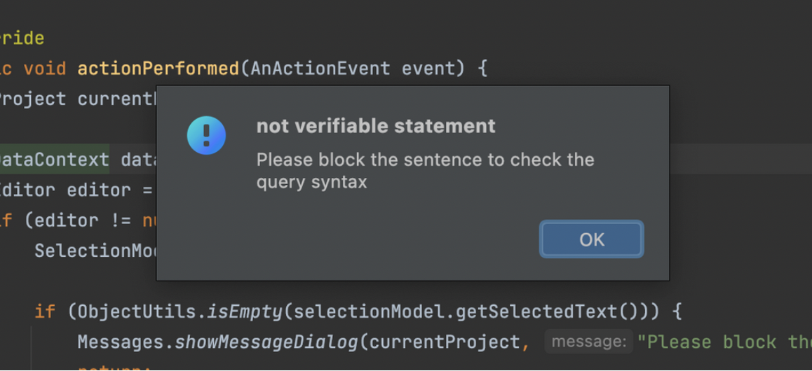 Messages.showMessageDialog(currentProject, "Please block the sentence to check the query syntax", "not verifiable statement" , Messages.getInformationIcon());