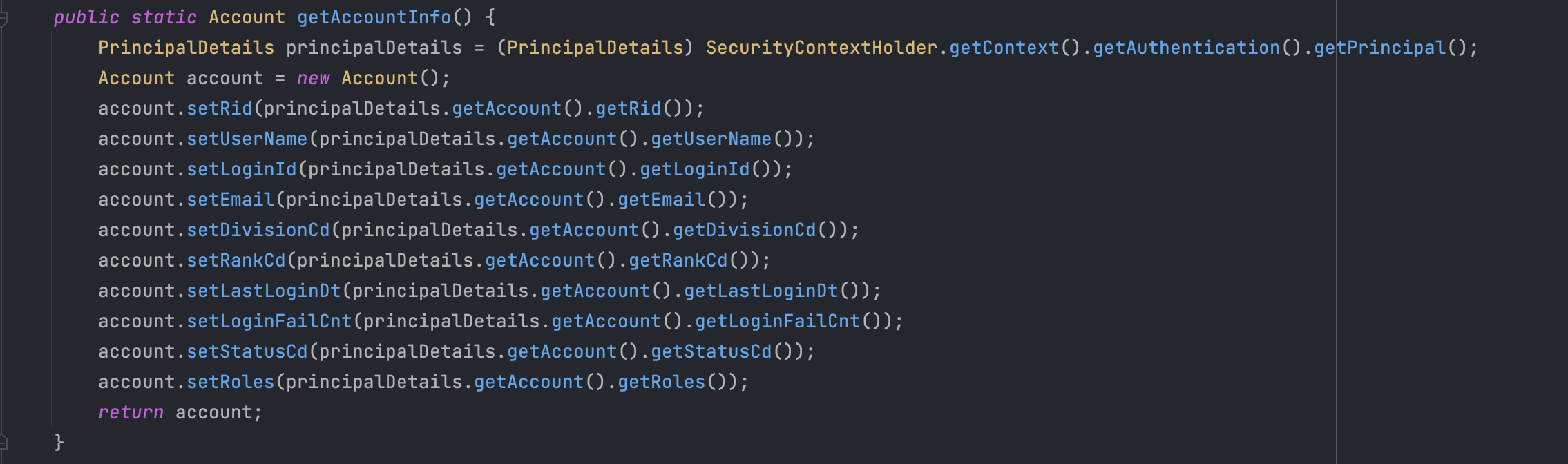 Account userEntity = AuthRepository.selectUserByLoginId(loginId);