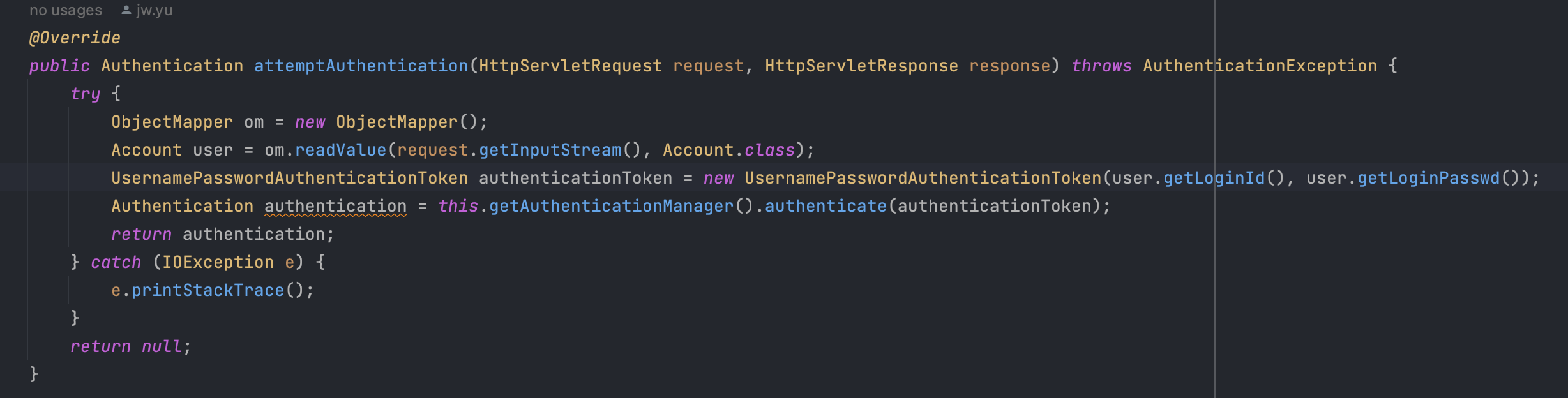 Authentication authentication = this.getAuthenticationManager().authenticate(authenticationToken);