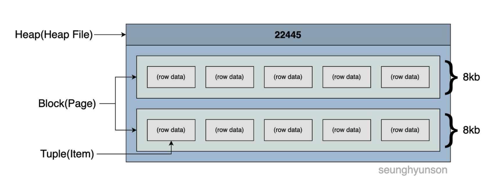 파일은 힙 파일이고, 힙 파일은 블록 - 튜플 단위로 구성된다.