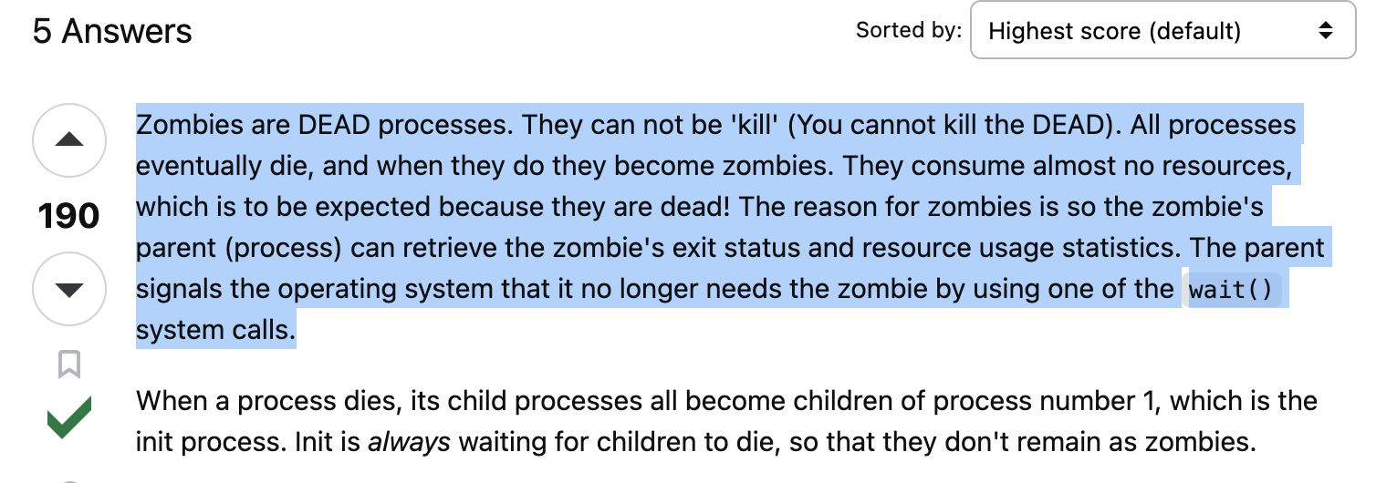 이미 죽은것과 다름없고, 부모 프로세스가 wait() 명령어를 내리지 않았기 때문에 남아있는 프로세스라고 한다. 리소스를 거의 안먹다 시피한다고 하니. 리소스 적인 문제는 없지만. pid를 차지하고 있는 문제가 있다.
