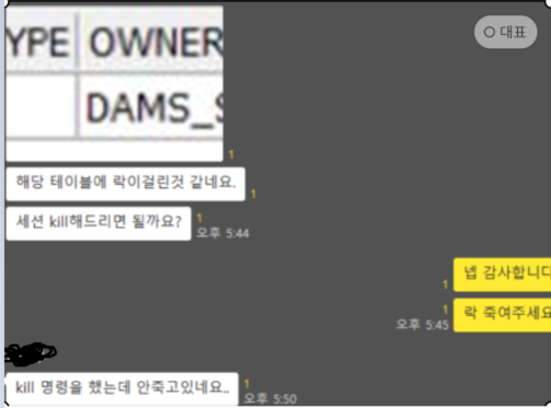 ✍ 관리자에게 Table Lock이 걸린것 같으니 확인해달라고 요청했고, 3개의 세션의 Lock을 죽여달라고 요청했다.