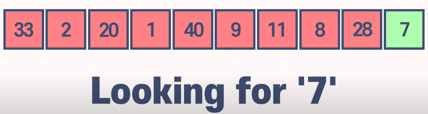 찾는 값이 없거나, 맨 마지막에 있다면.. 인풋의 값이 커질 수록 시간복잡도도 늘어나게 되는 문제가 있다.