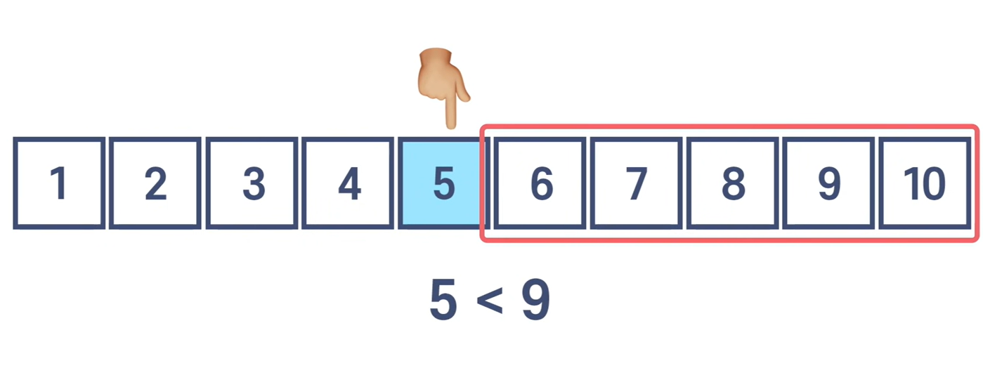 9를 찾는 데, 중간에서 시작한 값이 5라면 오른쪽 배열로 이동하면 된다.