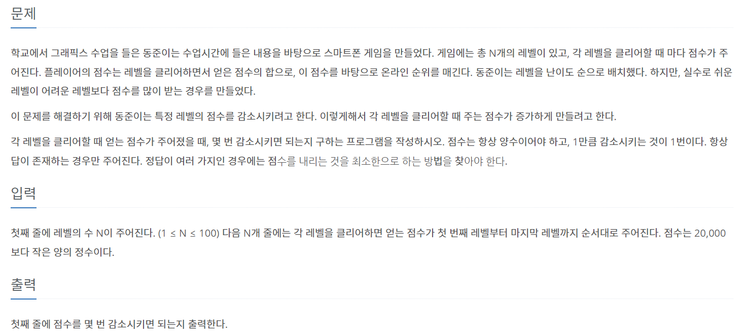 학교에서 그래픽스 수업을 들은 동준이는 수업시간에 들은 내용을 바탕으로 스마트폰 게임을 만들었다. 게임에는 총 N개의 레벨이 있고, 각 레벨을 클리어할 때 마다 점수가 주어진다. 플레이어