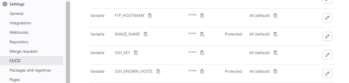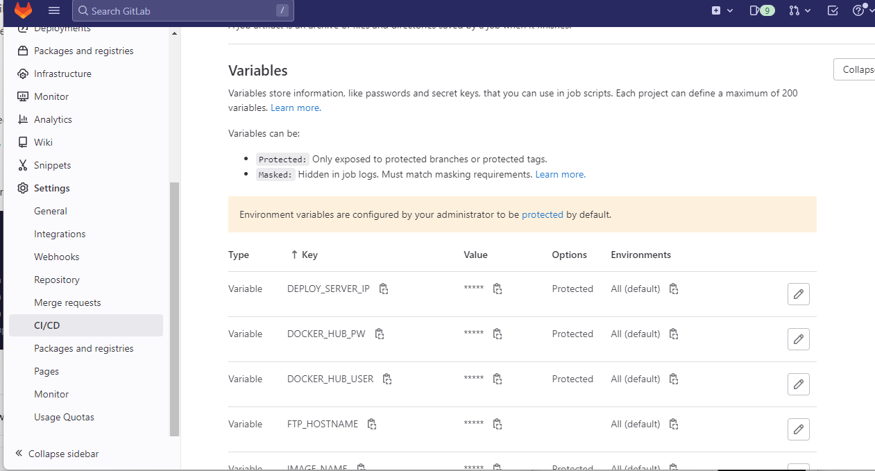 외부 변수들은 GitLab - Settings - CI / CD - Variables