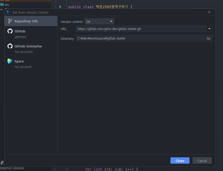 저장소를 클론하고 테스트할 연습 프로젝트를 올리도록 한다.