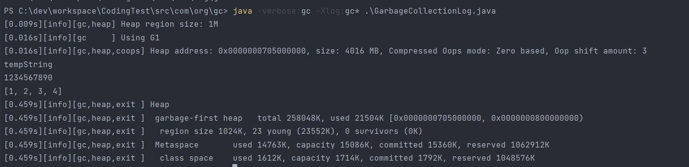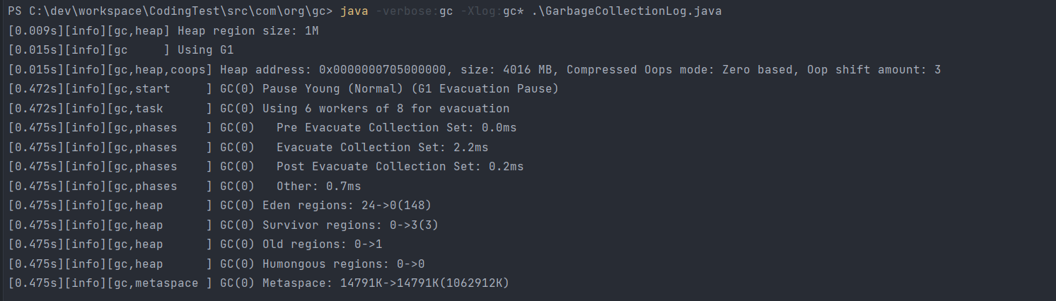 $ java -verbose:gc -Xlog:gc* .\GarbageCollectionLog.java
