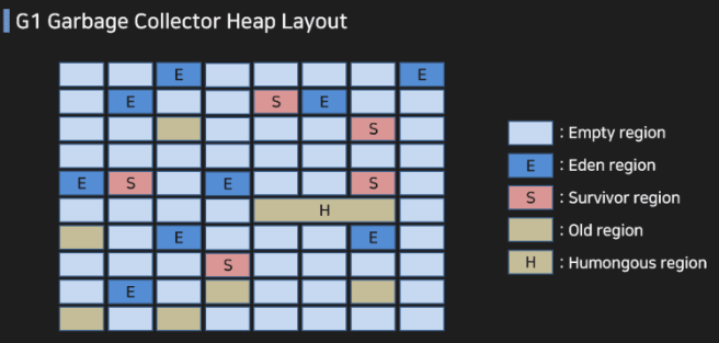 위의 Old / Young 영역을 사용하는 것과 달리 G1에서는 이러한 영역을 사용하지 않는다.