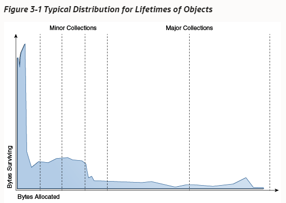 공식 문서에 따르면 대부분의 VM 종료시까지 유지되는 초기화 시 할당된 객체 외에는 위의 그림과 같은 그래프에 해당한다고 한다.
