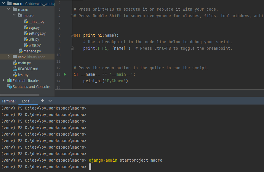venv : 가상화 환경 설정. ( 다른 프로젝트와의 세팅 공유를 피하기 위함 )