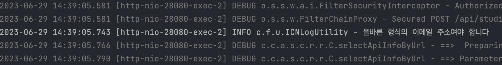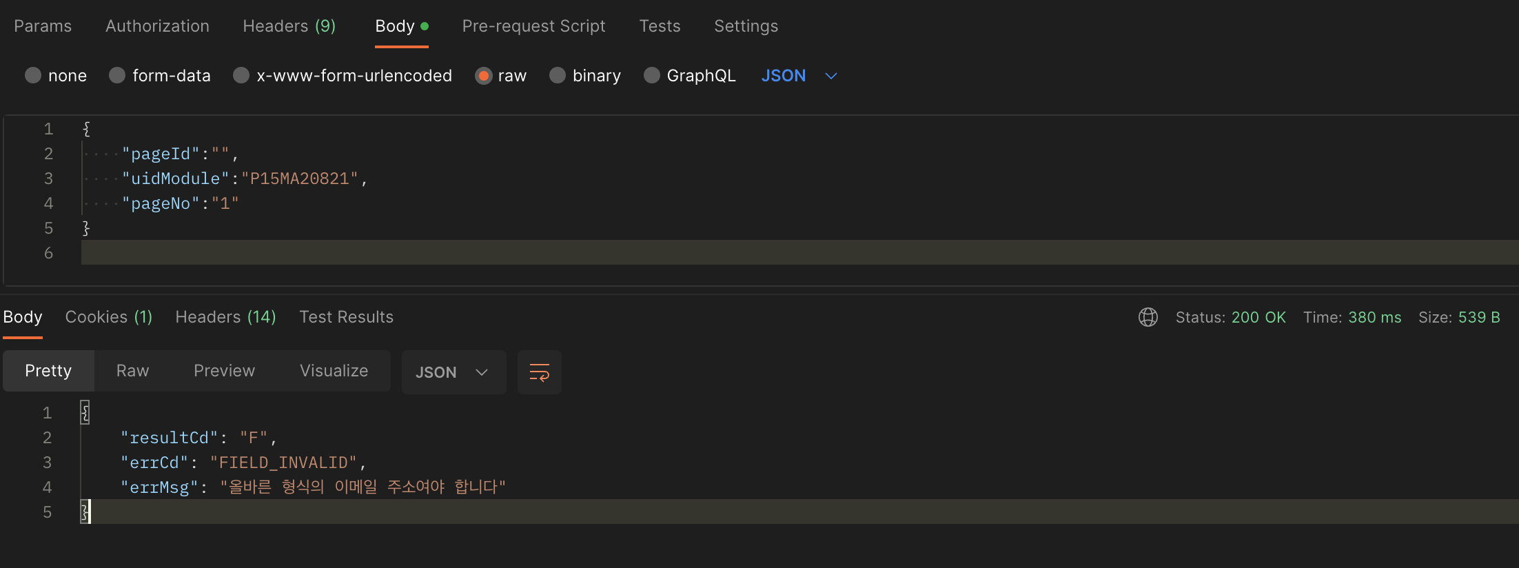 uidMoudle 항목에 값은 있지만 이메일 형식이 아니므로 에러를 리턴하는 것을 볼 수 있다.