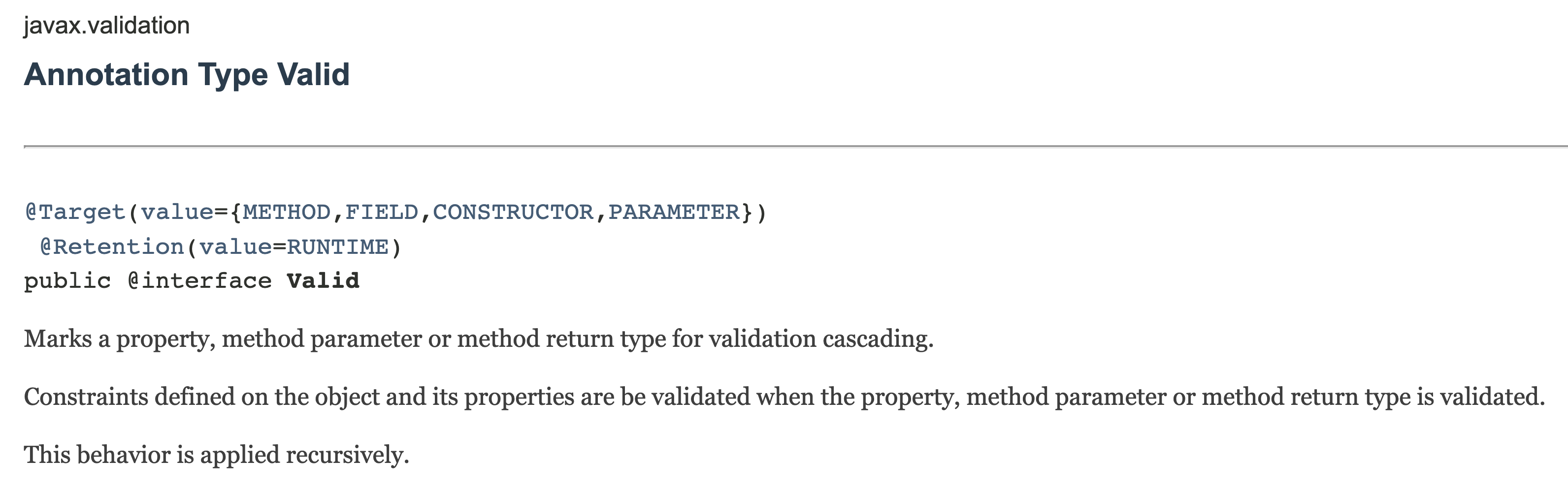 자바 표준 검증 애노테이션이다. @Validated와 동일한 역할이되, @Validated는 그룹을 지정해서 특정 그룹에 해당하는 유효성 검증을 따로 체크 할 수 있다.