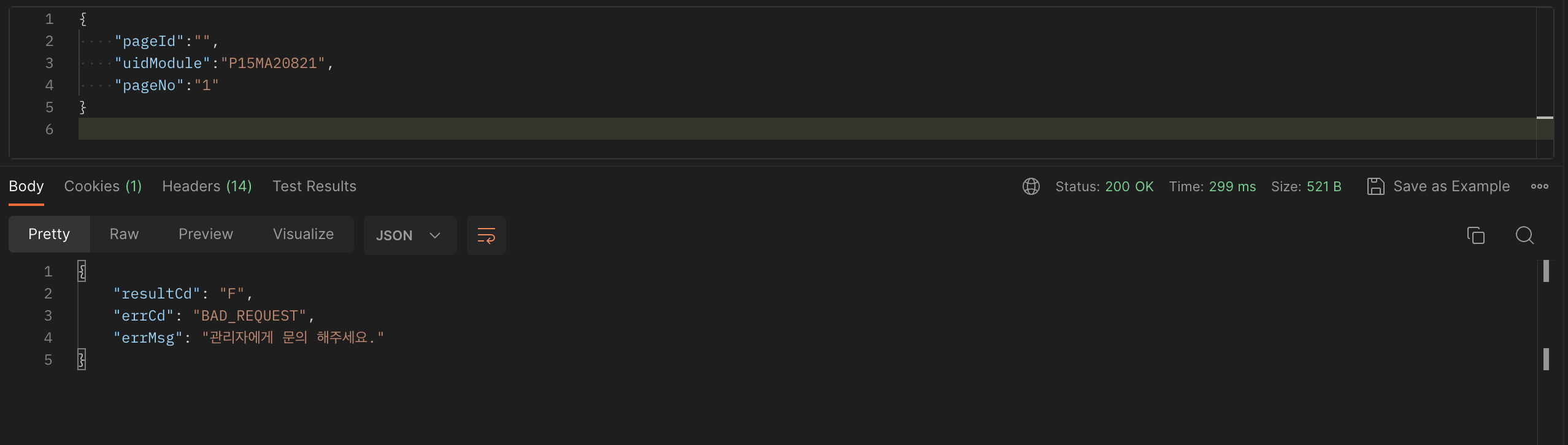 덧붙여서 테스트의 요청값은 성공으로 리턴이 오던 요청 데이터들이다.
